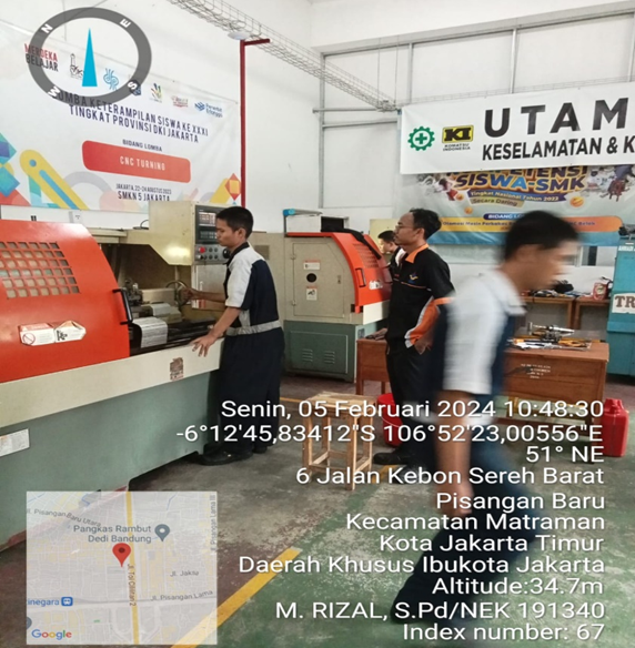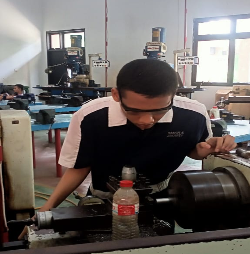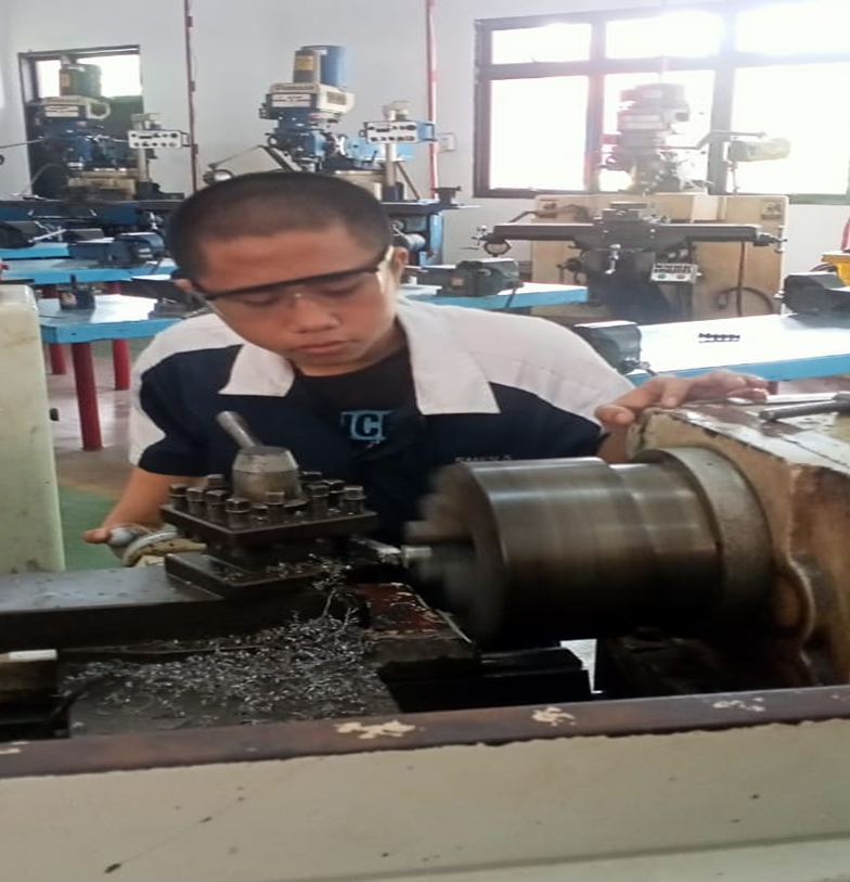 Siswa melakukan ujian Sertifikasi profesi Teknik mesin sedang melakukan proses pembuatan penda kerja yaitu poros dengan menggunakan mesin bubut manual, bubut CNC sama frais CNC.