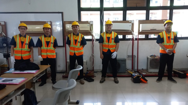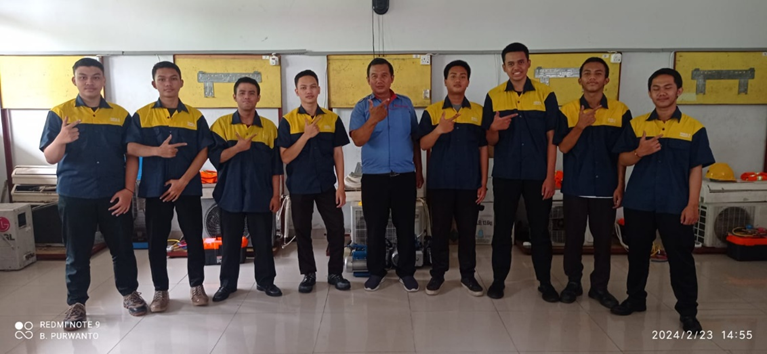 Asesor Pak Budy Harry Prasetyo pun memperhatikan dengan serius dan satu persatu di perhatikan langkah pengerjaan pemasangan AC Split.