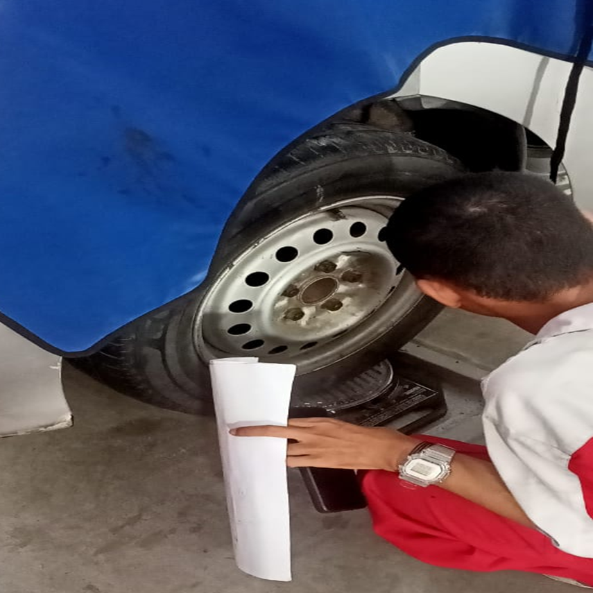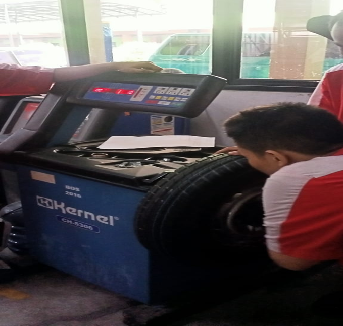 Salah satu siswa sedang melakukan Bancing Roda mobil untuk mencari titik diposisikan pemberat atau timah agar putaran mobil stabil dan di lakukan cek pada mesin komputer untuk mengecek putarnya stabil